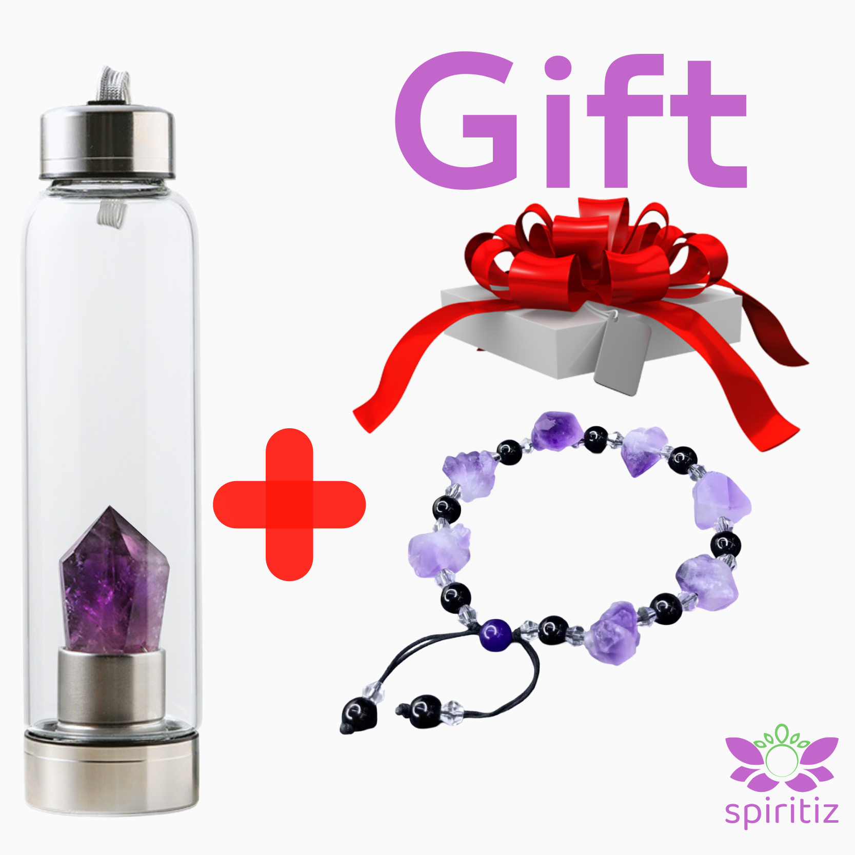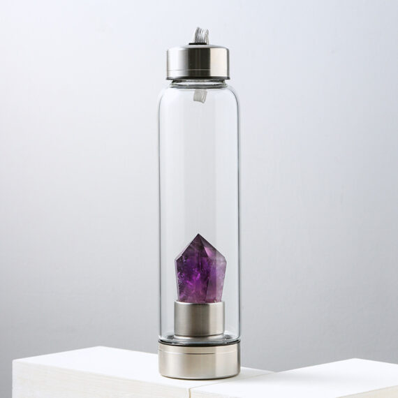 An elegant bottle made of pure glass, featuring a natural Amethyst crystal column at its base — the stone of clarity and spiritual healing. Amethyst is known for its ability to calm the mind, stimulate intuition, and realign inner energy. A modern design with a unique touch, perfect for home, outdoor walks, or moments of relaxation and meditation. Own one now and receive a gift in a beautiful package — a stylish and attractive Amethyst stone bracelet.